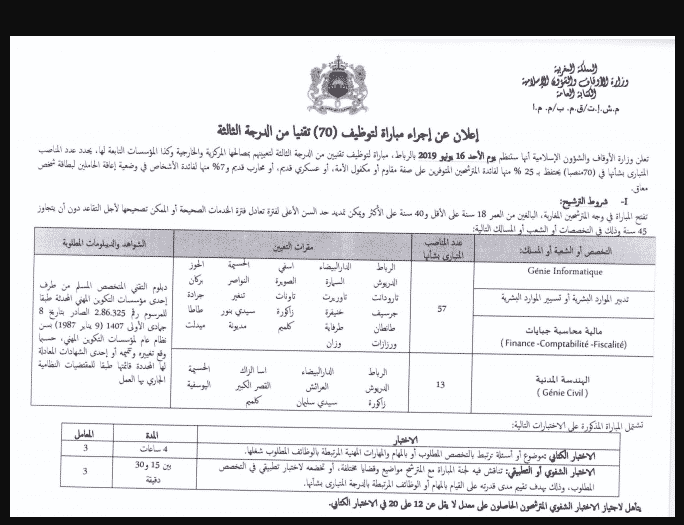 أعلنت مصلحة المباريات والامتحانات بقسم الموارد البشرية في وزارة الأوقاف والشؤون الإسلامية، عن إجراء مباريات لتوظيف (10) مهندسي دولة من الدرجة الأولى، (26) متصرفا من الدرجة الثانية، و(70) تقنيا من الدرجة الثالثة، لتعيينهم بمصالح الوزارة المركزية والخارجية وكذا المؤسسات التابعة لها، وذلك يوم الآحد 16 يونيو 2019م. وفيما يلي: